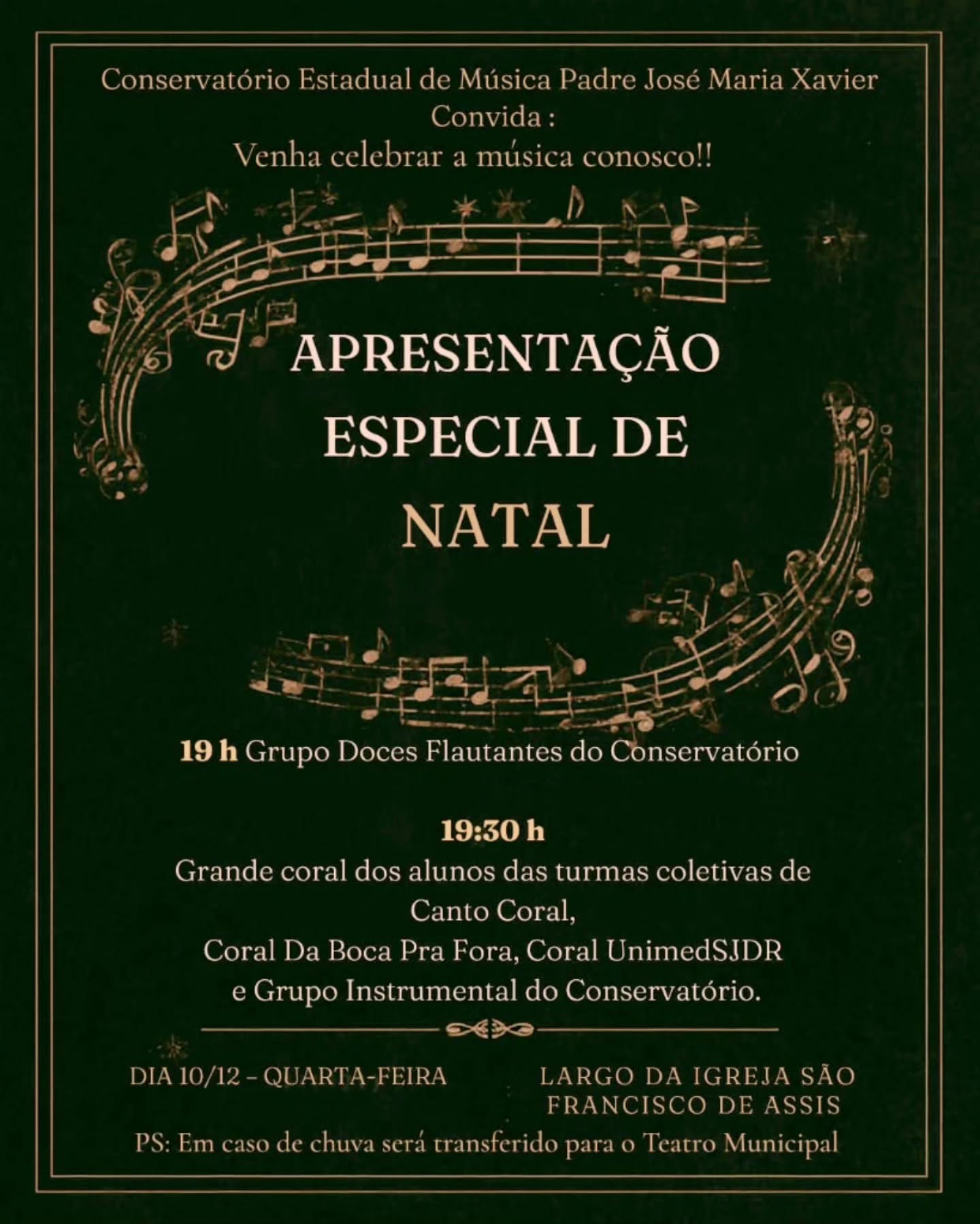 A Apresentação Especial de Natal do Conservatório Estadual de Música Padre José Maria Xavier será realizada no dia 10 de dezembro de 2025 (quarta-feira), a partir das 19h, em São João del-Rei (MG). O evento é promovido pelo conservatório e integra a programação cultural natalina da cidade, reunindo alunos e professores em uma apresentação aberta ao público.