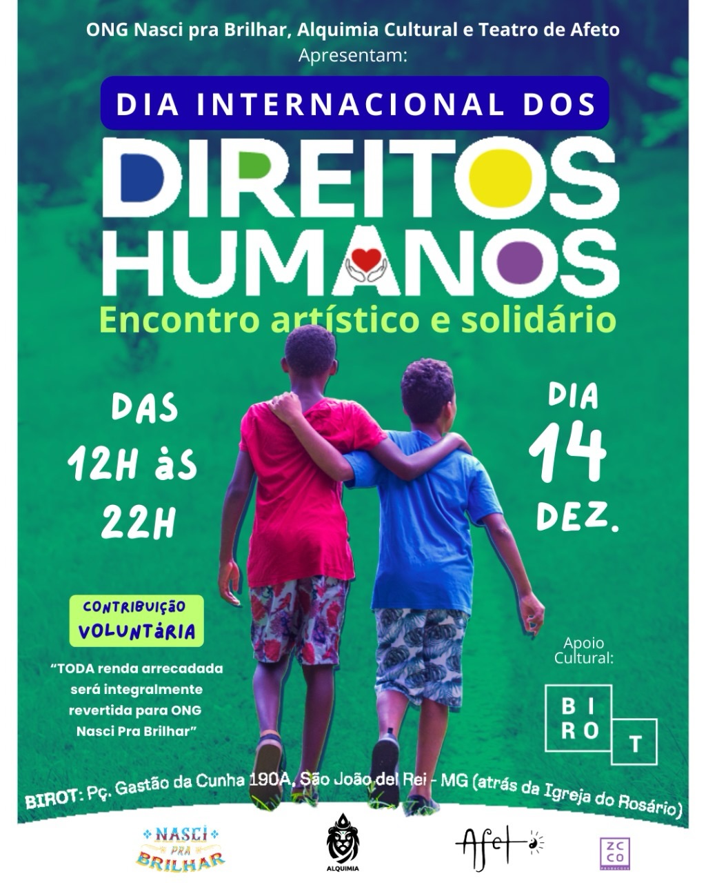 O evento “Dia Internacional dos Direitos Humanos – Encontro Artístico e Solidário” será realizado no dia 14 de dezembro, das 12h às 22h, em São João del-Rei (MG), com contribuição voluntária. A atividade marca o início das ações da ONG Nasci Pra Brilhar na cidade e é apresentada em parceria com Alquimia Cultural e Teatro de Afeto, reunindo arte, solidariedade e mobilização comunitária.