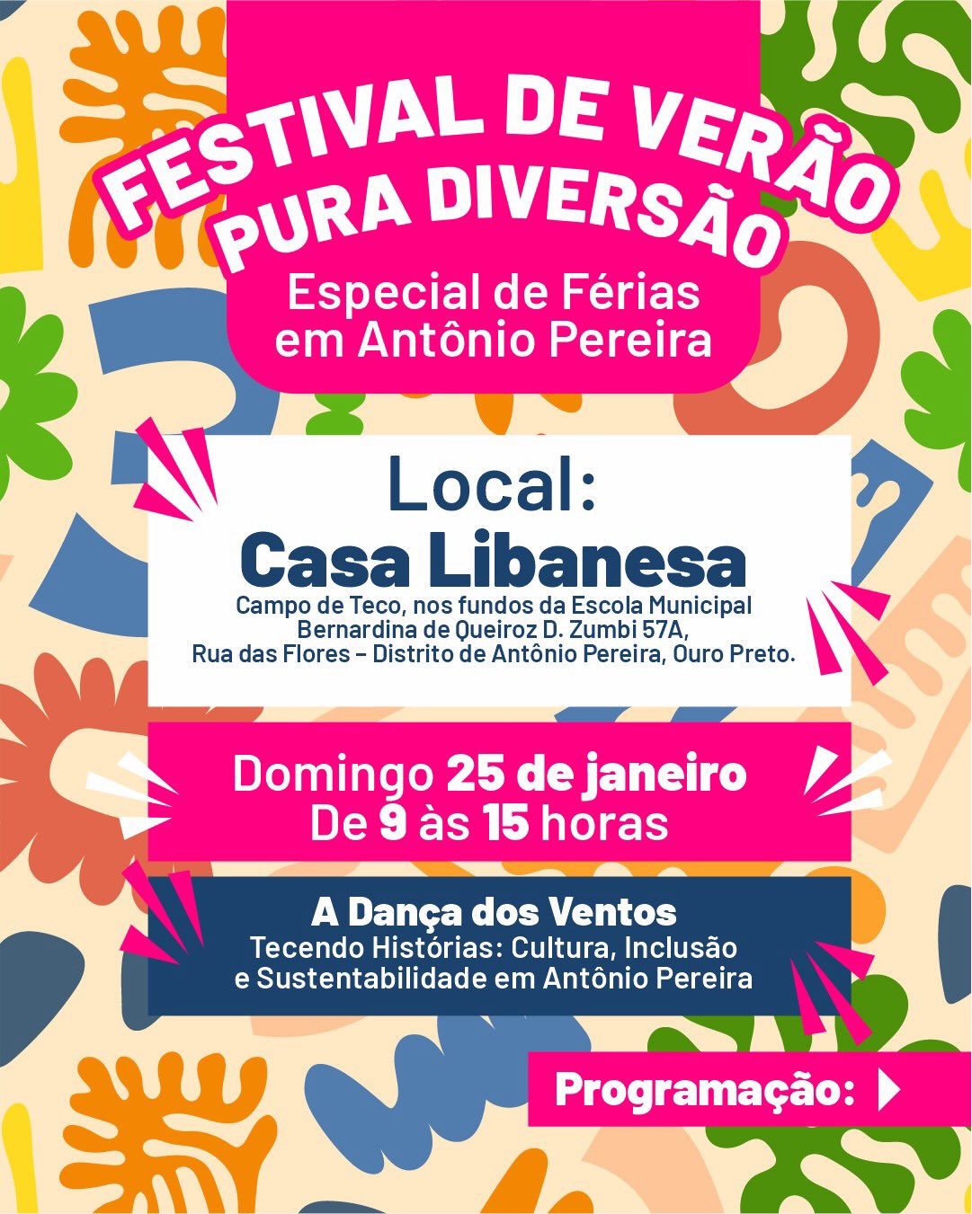 O Festival de Verão – Pura Diversão | Especial Ouro Preto será realizado no domingo, 25 de janeiro, das 9h às 15h, no distrito de Antônio Pereira, em Ouro Preto (MG). A atividade integra a programação especial de férias e acontece na Casa Libanesa, localizada no Campo de Teco, nos fundos da Escola Municipal Bernardina de Queiroz D. Zumbi, na Rua das Flores, nº 57A. O evento é aberto ao público e voltado a pessoas de todas as idades.