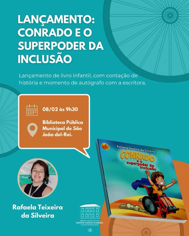 O lançamento do livro infantil “Conrado e o Superpoder da Inclusão” será realizado no dia 8 de fevereiro de 2026, às 9h30, na Biblioteca Pública Municipal de São João del-Rei (MG). A obra é de autoria de Rafaela Teixeira da Silveira e será apresentada ao público em um evento voltado para crianças, famílias e educadores.