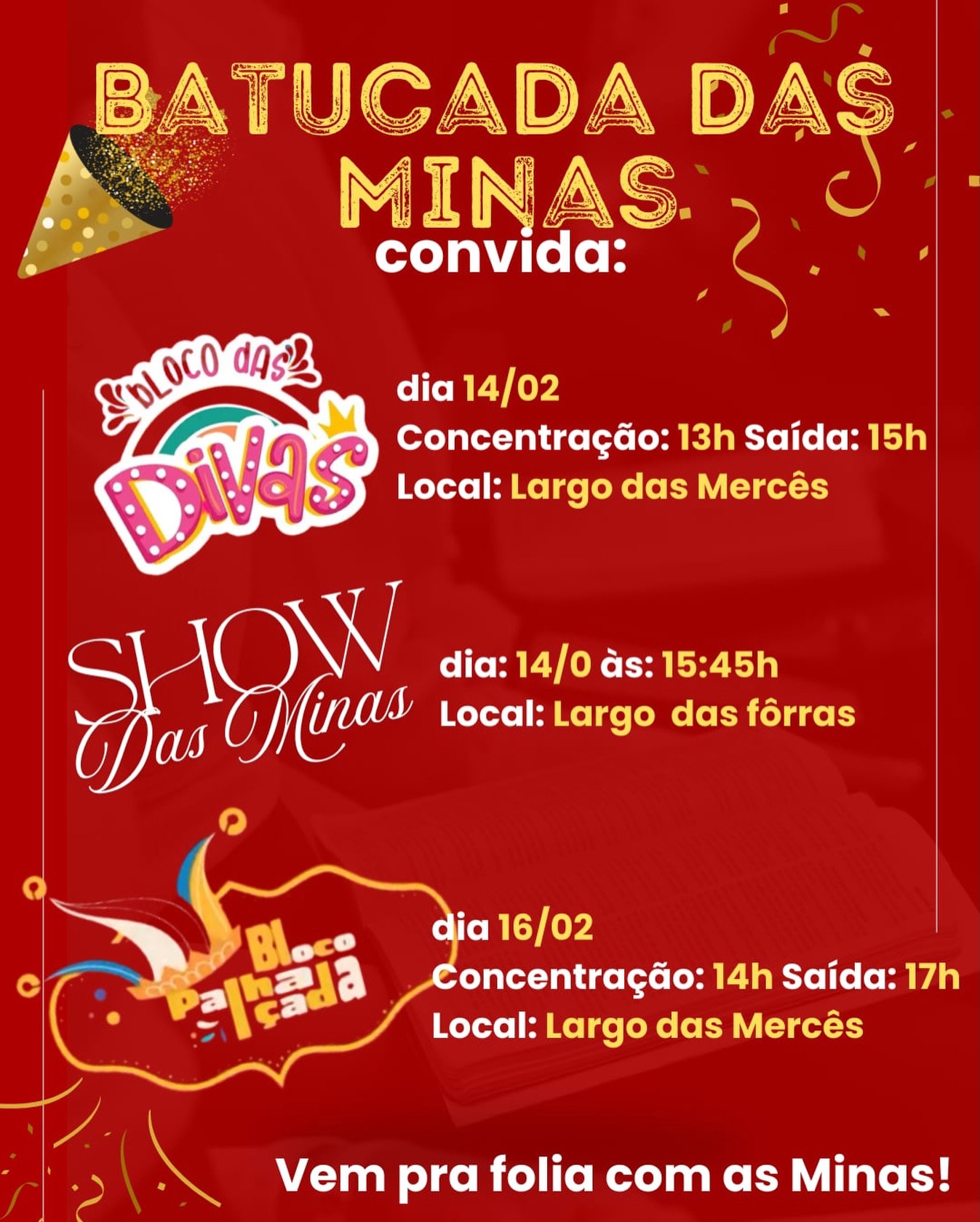 No dia 14 de fevereiro, a Batucada das Minas convida o Bloco das Divas para um desfile com concentração às 13h e saída às 15h, no Largo das Mercês. Na sequência, ocorre o show da Batucada das Minas, às 15h45, no Largo das Forras.