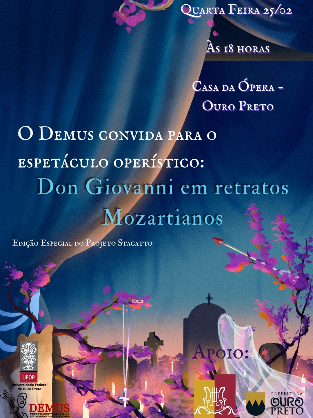 O espetáculo operístico “Don Giovanni em retratos mozartianos” será apresentado na quarta-feira, 25 de fevereiro, às 18h, na Casa da Ópera, em Ouro Preto. A apresentação integra uma edição especial do Projeto Staccatto, dedicada à difusão da ópera e do repertório clássico em espaços históricos.