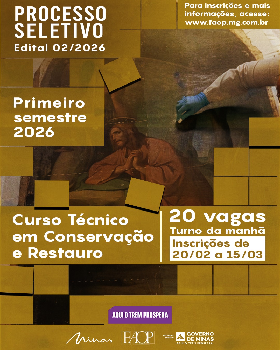 O período de inscrições vai de 20 de fevereiro a 15 de março. Podem participar candidatos que tenham concluído o ensino médio ou que estejam cursando o 2º ano. O processo seletivo é voltado à formação técnica na área de conservação e restauro de bens culturais, com ingresso previsto para o primeiro semestre de 2026.