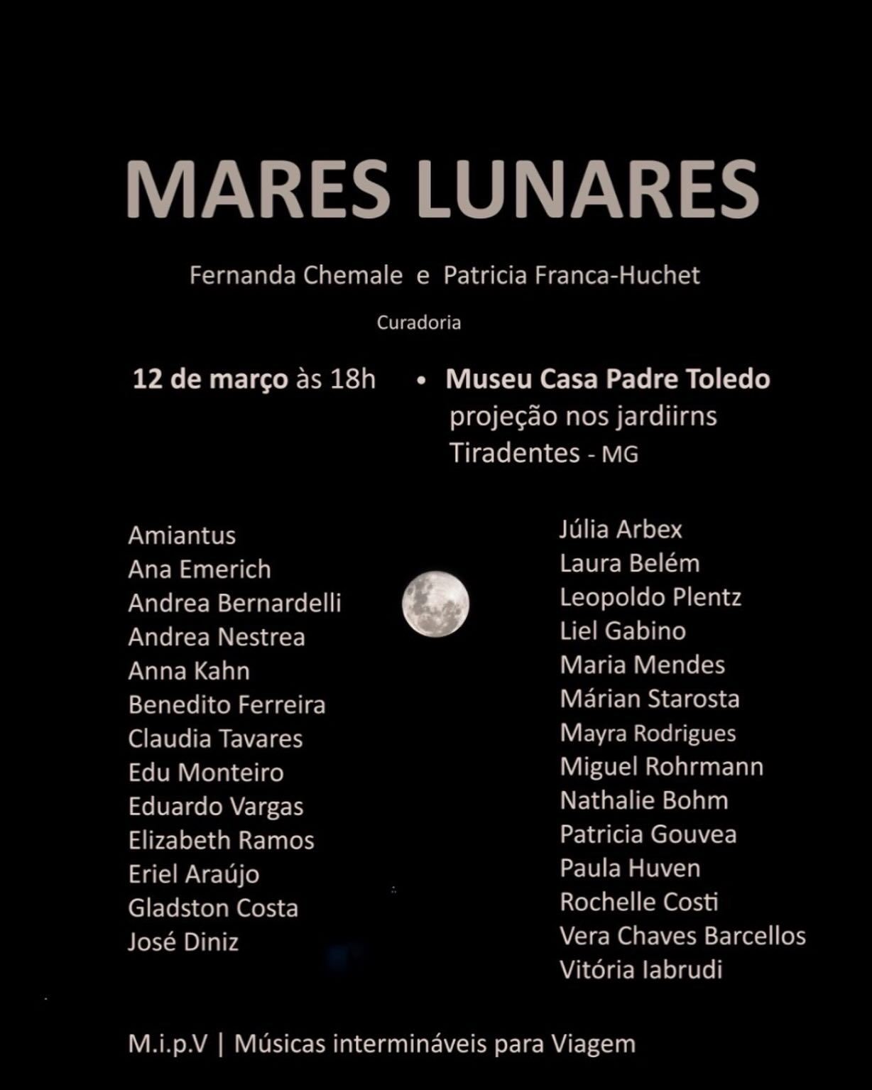 O evento Mares Lunares é uma projeção de fotografias com curadoria de Fernanda Chemale e Patricia Franca-Huchet, realizada no dia 12 de março de 2026, às 18h, no Museu Casa Padre Toledo, com exibição nos jardins, em Tiradentes. A ação integra a programação do Festival de Verão da UFMG, em parceria com o Festival Internacional de Fotografia de Tiradentes Foto em Pauta.
