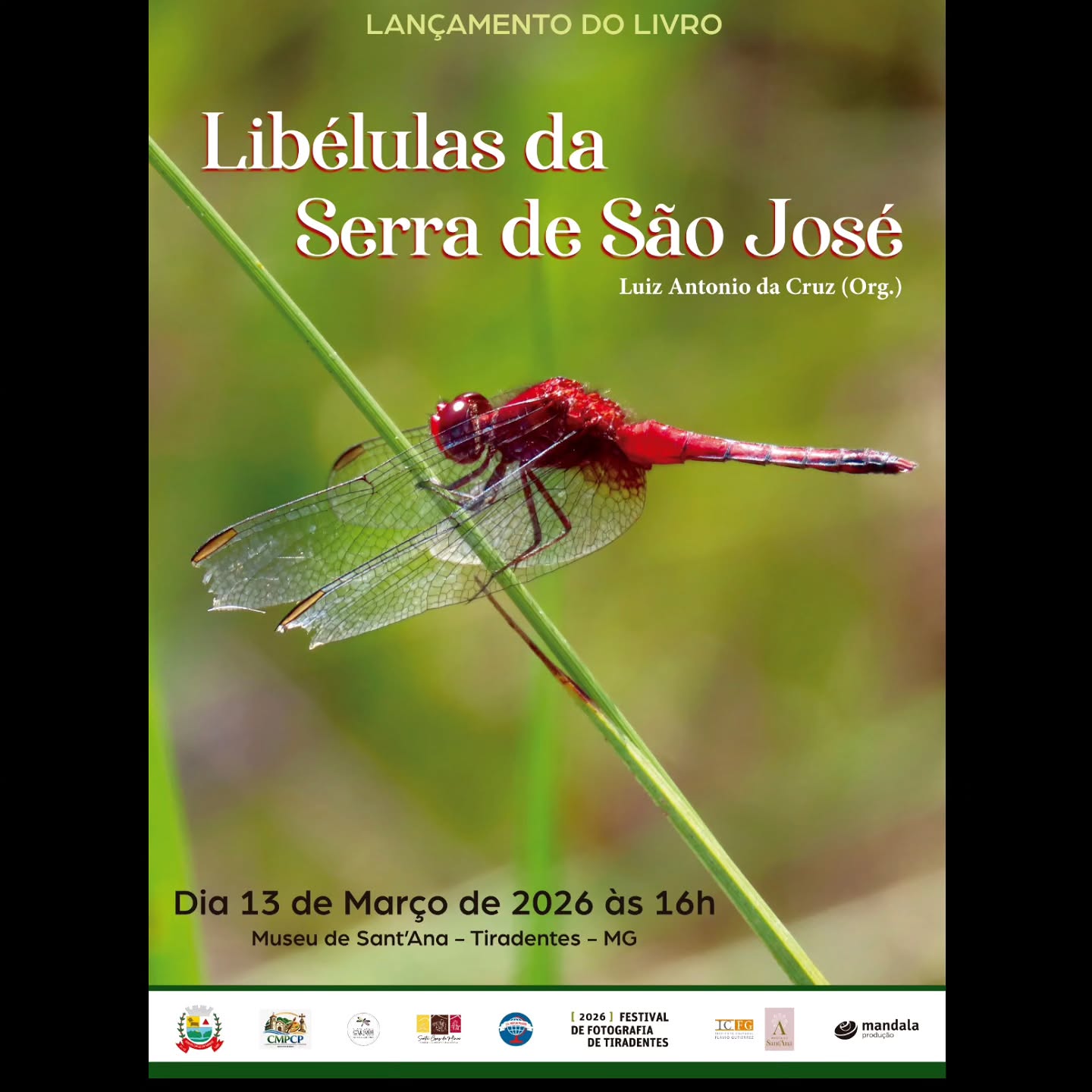 O lançamento do livro “Libélulas da Serra de São José”, organizado por Luiz Antonio da Cruz, será realizado em 13 de março de 2026, às 16h, no Museu de Sant’Ana, em Tiradentes. A atividade integra a programação do Festival de Fotografia de Tiradentes.