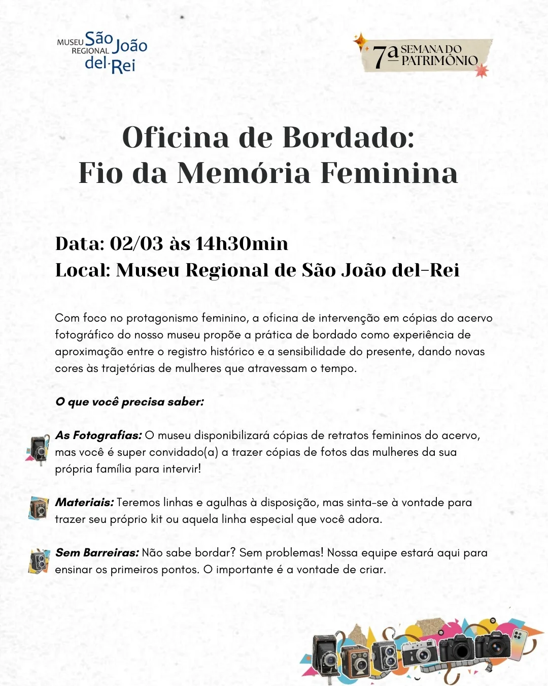 A Oficina de Bordado: Fio da Memória Feminina integra a programação da 7ª Semana do Patrimônio e será realizada no dia 02 de março, às 14h30, no Museu Regional de São João del-Rei. A atividade propõe uma reflexão sobre memória, fotografia e práticas manuais, com acesso gratuito ao público interessado em patrimônio cultural e artes têxteis.