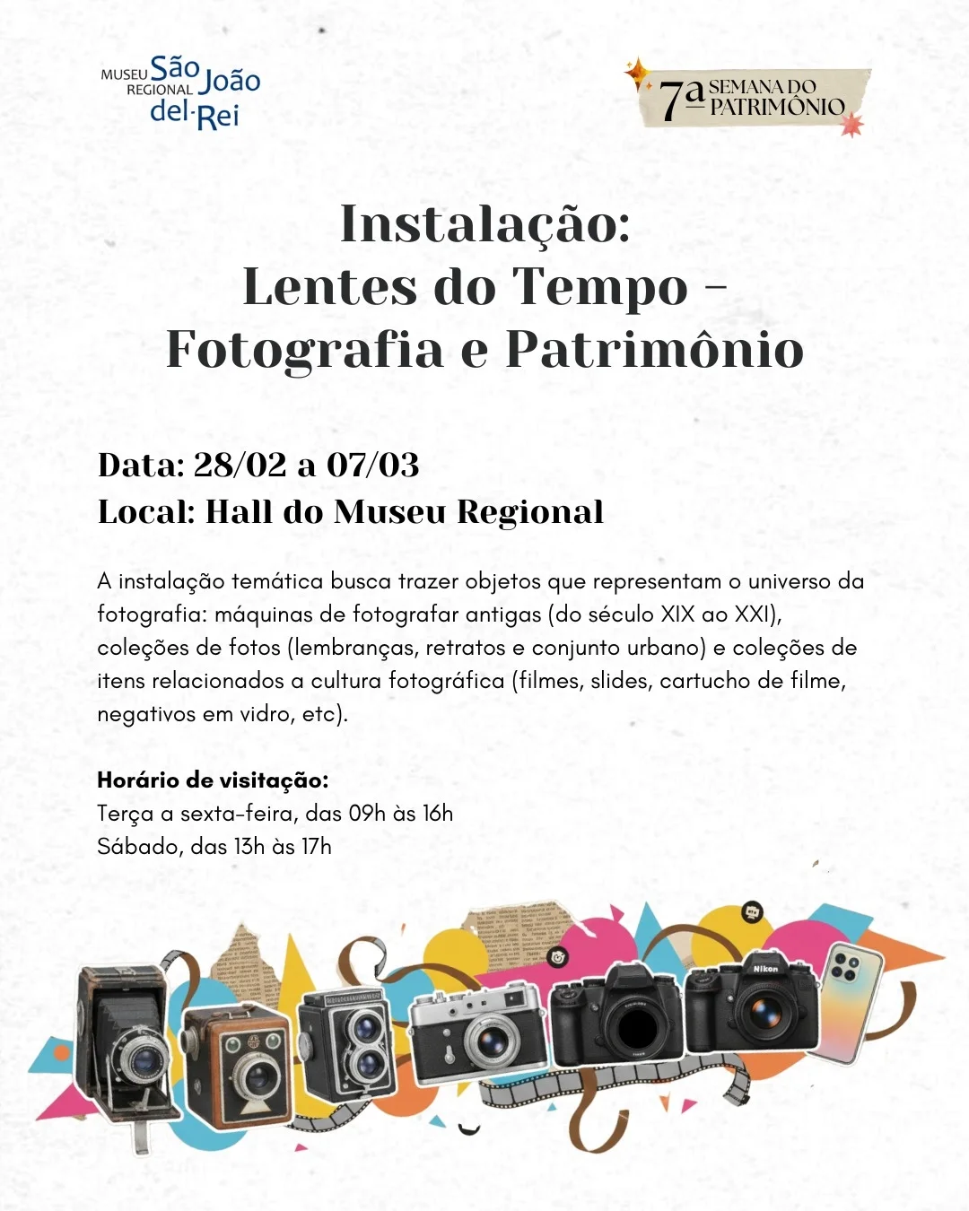 A instalação “Lentes do Tempo – Fotografia e Patrimônio” integra a programação da 7ª Semana do Patrimônio e estará aberta à visitação entre os dias 28 de fevereiro e 07 de março, no Hall do Museu Regional de São João del-Rei, em São João del-Rei. A atividade propõe uma abordagem expositiva voltada à relação entre fotografia e patrimônio cultural.