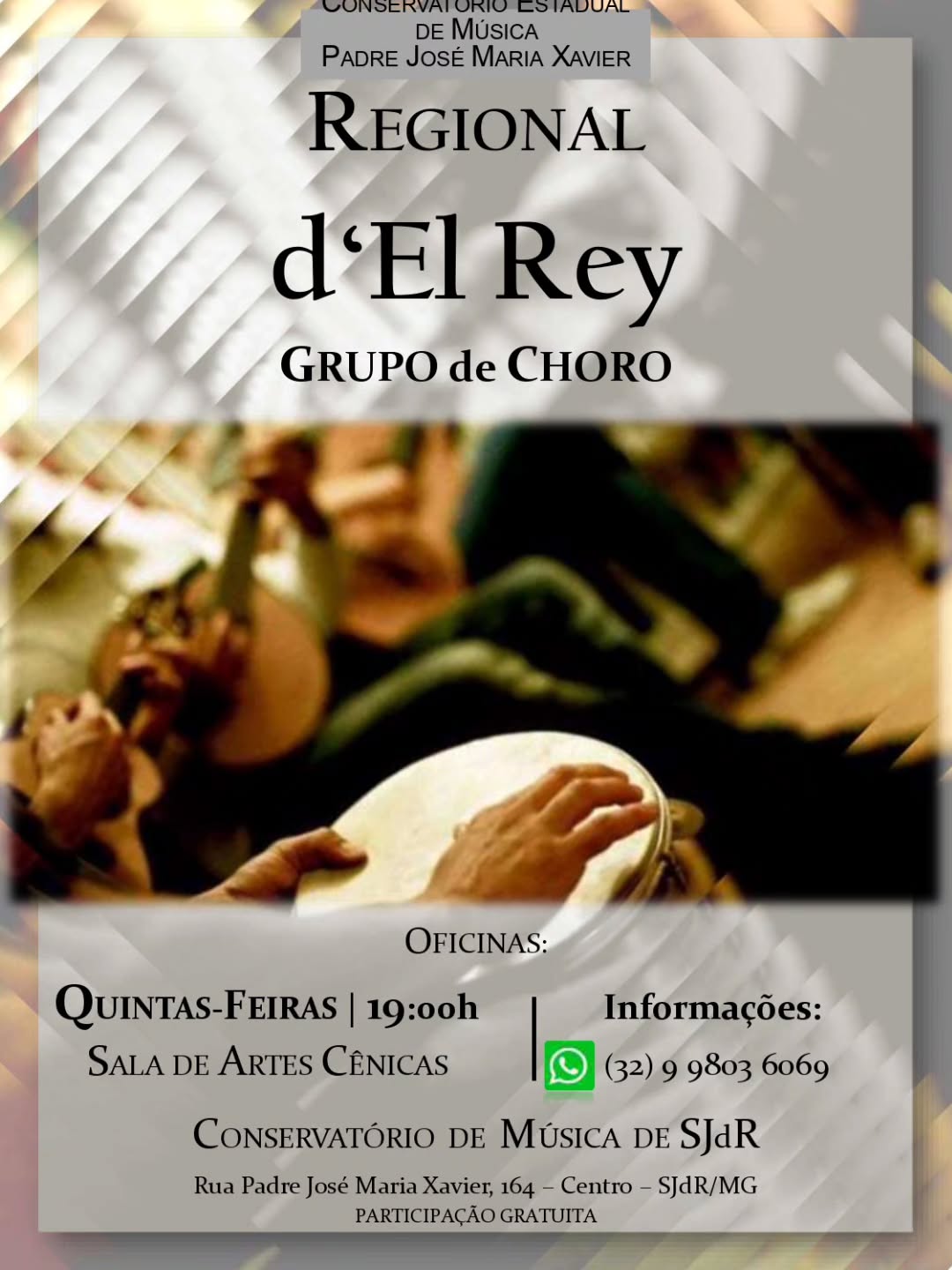 O Grupo de Choro Regional d’El Rey, vinculado ao Conservatório Estadual de Música Padre José Maria Xavier, em São João del-Rei (MG), realiza oficinas semanais de choro abertas à comunidade. As atividades acontecem às quintas-feiras, às 19h, na Sala de Artes Cênicas do conservatório, localizado na Rua Padre José Maria Xavier, 164, Centro, com participação gratuita.