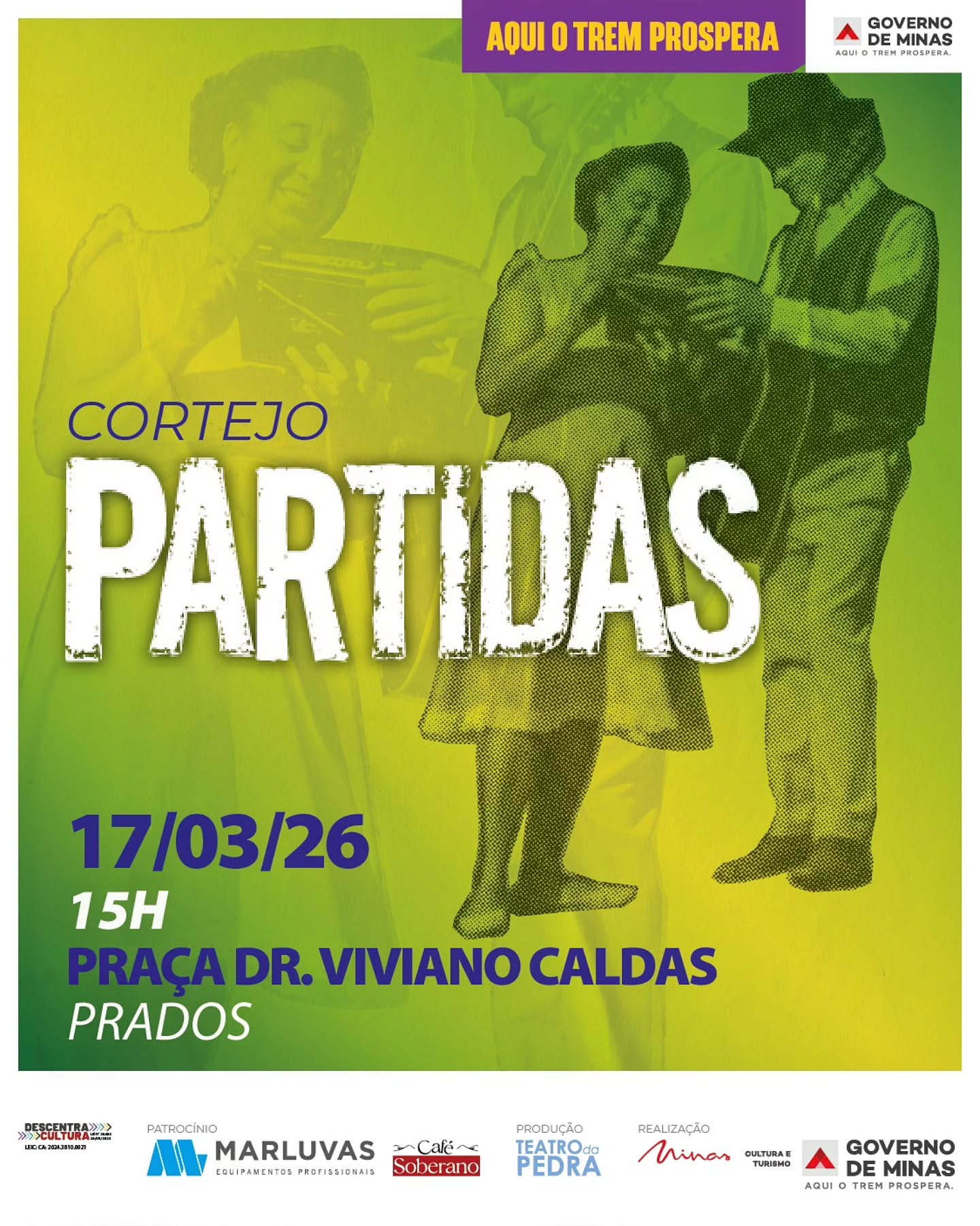 O Cortejo “Partidas” será realizado pelo Teatro da Pedra no dia 17 de março, às 15h, com início na Praça Dr. Viviano Caldas, na cidade de Prados (MG). A atividade integra ações de circulação cultural que promovem intervenções artísticas em espaços públicos, aproximando o teatro e a música da comunidade.