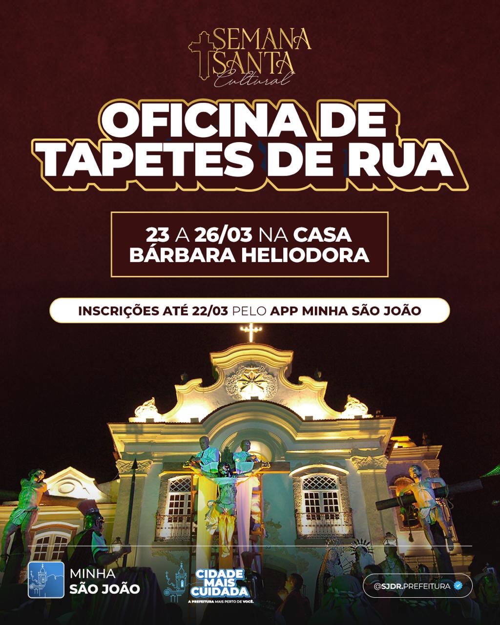 A Oficina de Tapetes de Rua será realizada entre os dias 23 e 26 de março, na Casa Bárbara Heliodora, em São João del-Rei (MG), como parte da programação da Semana Santa Cultural. A atividade integra as celebrações tradicionais do município, promovendo a preservação de práticas culturais ligadas à religiosidade e à participação comunitária.