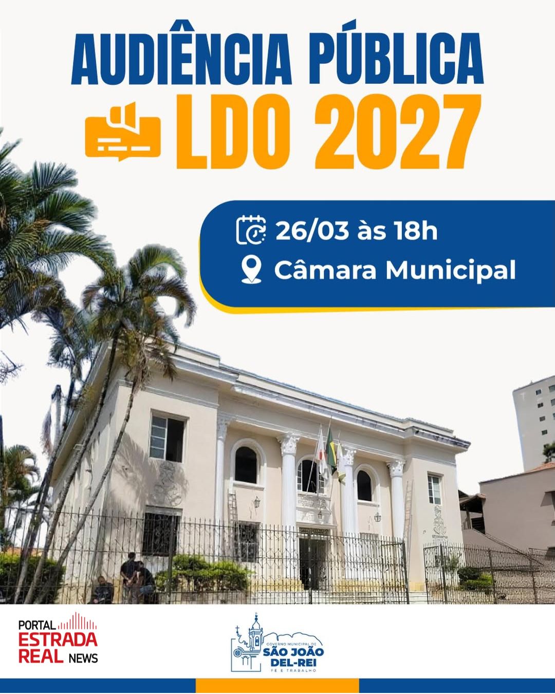 A Audiência Pública para discussão da Lei de Diretrizes Orçamentárias (LDO) será realizada no dia 26 de março, às 18h, na Câmara Municipal de São João del-Rei (MG). A iniciativa é promovida pela Prefeitura Municipal e integra os instrumentos de participação popular na definição das políticas públicas.
