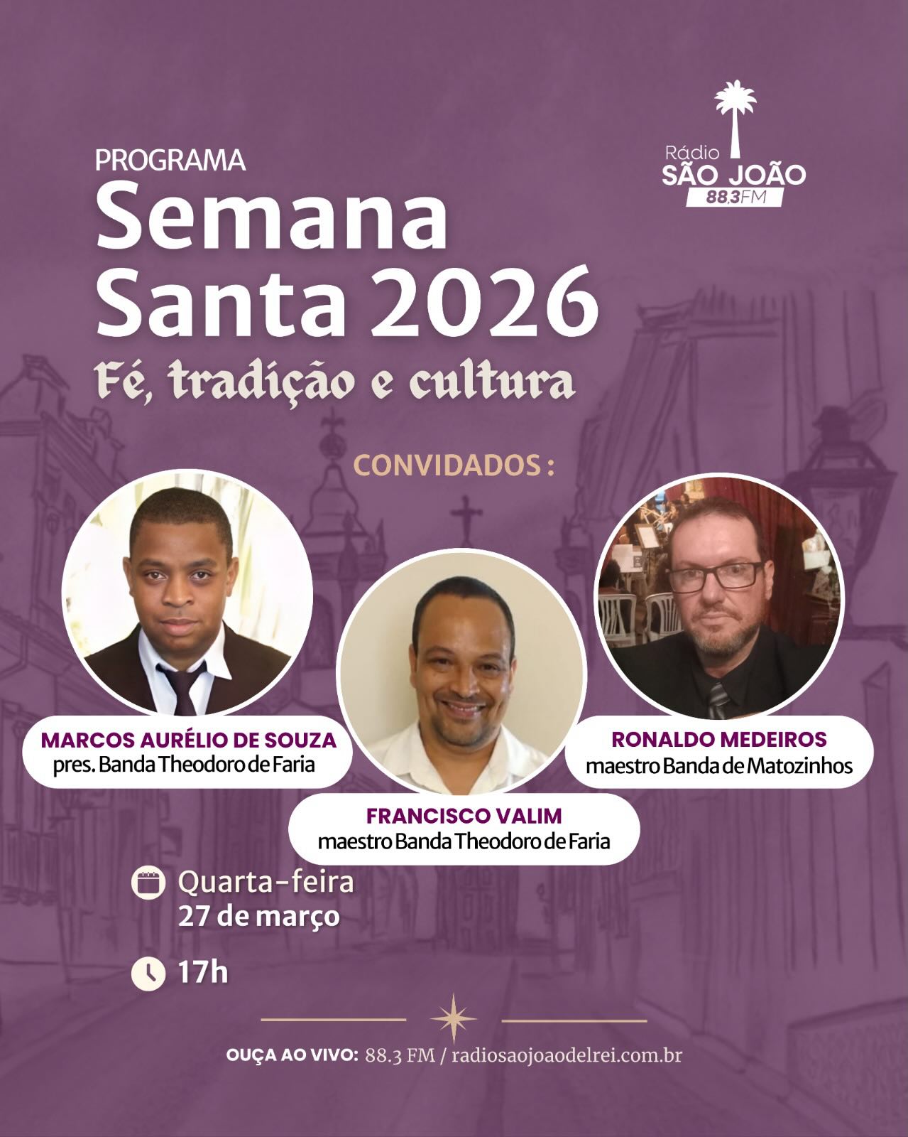 O programa “Semana Santa 2026: Fé, Tradição e Cultura”, da Rádio São João del-Rei (88,3 FM), será transmitido no dia 27 de março, às 17h, com participação de convidados ligados à tradição musical da cidade. A iniciativa integra a programação especial dedicada às celebrações da Semana Santa, abordando aspectos históricos, culturais e religiosos.
