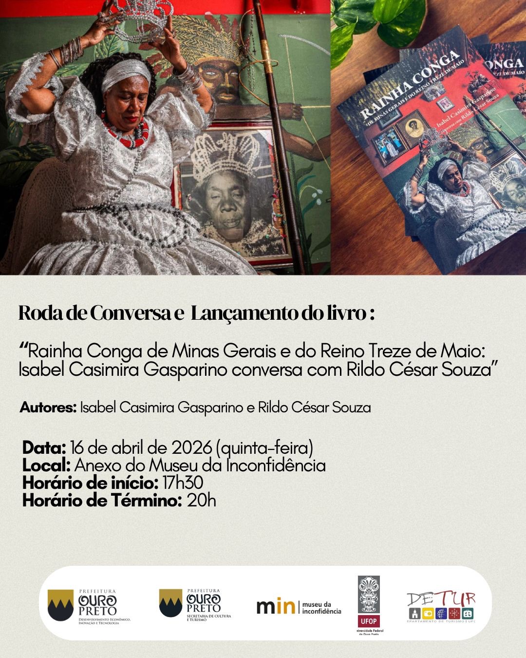 A Roda de Conversa e Lançamento do livro “Rainha Conga de Minas Gerais e do Reino Treze de Maio: Isabel Casimira Gasparino conversa com Rildo César Souza” será realizada no dia 16 de abril de 2026, das 17h30 às 20h, no Anexo do Museu da Inconfidência, em Ouro Preto. O evento reúne os autores Isabel Casimira Gasparino e Rildo César Souza em uma atividade aberta ao público.