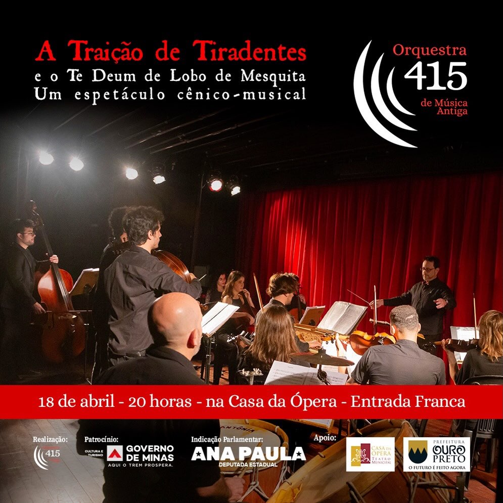 O espetáculo cênico-musical “A Traição de Tiradentes” será apresentado pela Orquestra 415 no dia 18 de abril de 2026, às 20h, no Teatro Municipal Casa da Ópera, em Ouro Preto. A apresentação integra uma pequena turnê de estreia da temporada e terá entrada gratuita, com retirada de ingressos na portaria.
