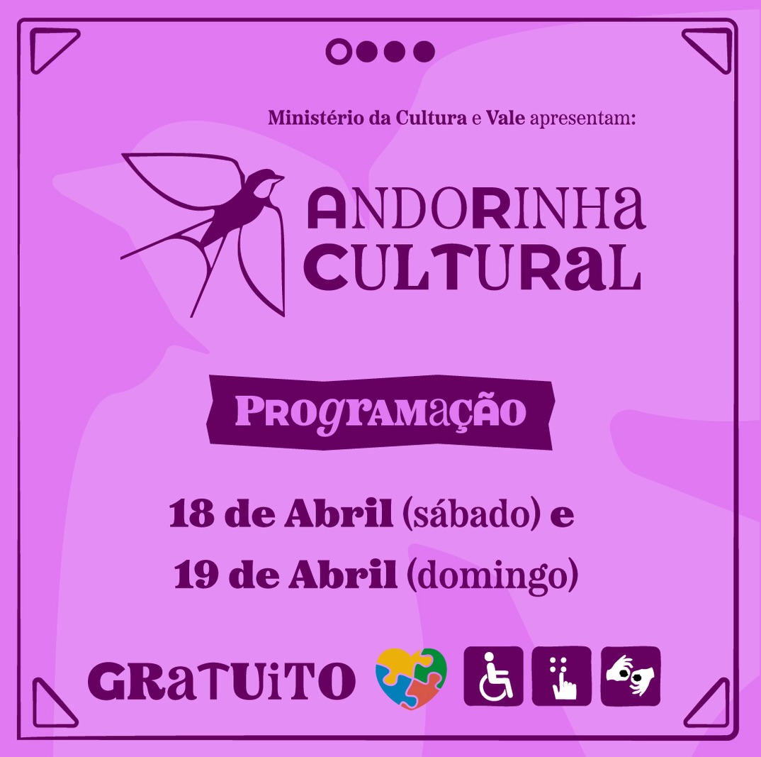 A 3ª edição do Andorinha Cultural será realizada nos dias 18 e 19 de abril de 2026, no Parque Natural Municipal das Andorinhas, em Ouro Preto. O evento tem entrada gratuita e é apresentado pelo Ministério da Cultura em parceria com a Vale, reunindo atividades culturais, ambientais e de bem-estar em um espaço de preservação natural.