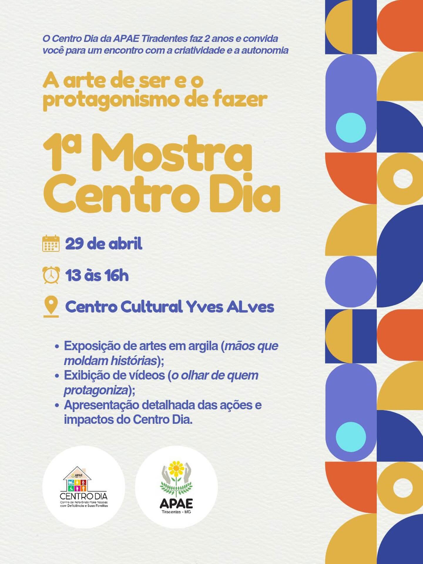 A 1ª Mostra Centro Dia – “A arte de ser e o protagonismo de fazer” será realizada no dia 29 de abril de 2026, das 13h às 16h, no Centro Cultural Yves Alves, em Tiradentes. O evento marca a celebração dos 2 anos do Centro Dia da APAE Tiradentes, reunindo atividades voltadas à valorização da autonomia, criatividade e protagonismo dos assistidos.