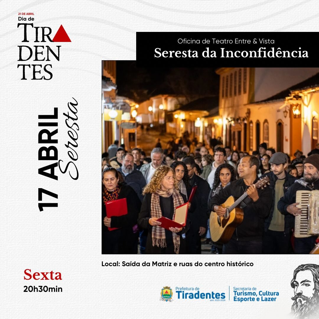 A Seresta da Inconfidência será realizada no dia 17 de abril de 2026 (sexta-feira), com início às 20h30, na cidade de Tiradentes (MG), com concentração e saída a partir da Matriz de Santo Antônio, seguindo pelas ruas do centro histórico. A ação integra a programação cultural em alusão ao Dia de Tiradentes (21 de abril) e propõe uma vivência artística itinerante, aberta ao público.