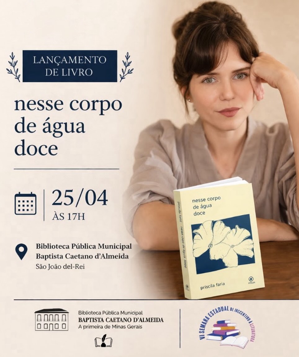O lançamento do livro “nesse corpo de água doce”, de Priscila Faria, será realizado no dia 25 de abril de 2026 (sábado), às 17h, na Biblioteca Pública Municipal Baptista Caetano d’Almeida, em São João del-Rei (MG). A atividade integra a programação da VI Semana Estadual de Incentivo à Literatura, iniciativa voltada à promoção do livro, da leitura e da produção literária em Minas Gerais.