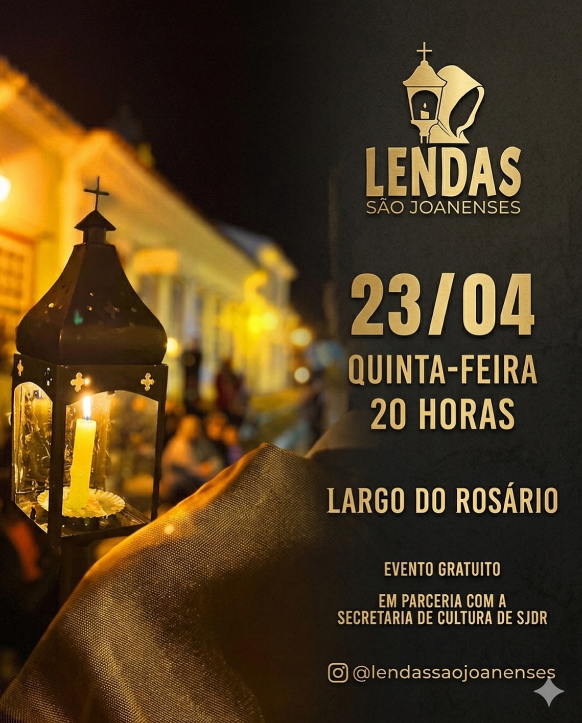 O evento “Lendas São-Joanenses” será realizado no dia 23 de abril de 2026 (quinta-feira), às 20h, no Largo do Rosário, em São João del-Rei (MG). Com entrada gratuita, a atividade integra ações culturais voltadas à valorização da memória e das tradições locais, sendo promovida em parceria com a Secretaria de Cultura do município.