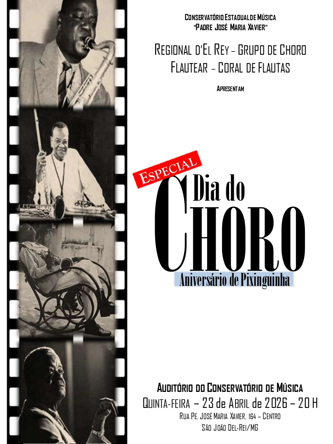 O Especial Dia do Choro – Aniversário de Pixinguinha será realizado no dia 23 de abril de 2026 (quinta-feira), às 20h, no Auditório do Conservatório Estadual de Música Padre José Maria Xavier, em São João del-Rei (MG). A apresentação celebra o legado do compositor brasileiro Pixinguinha, referência fundamental na história do choro.