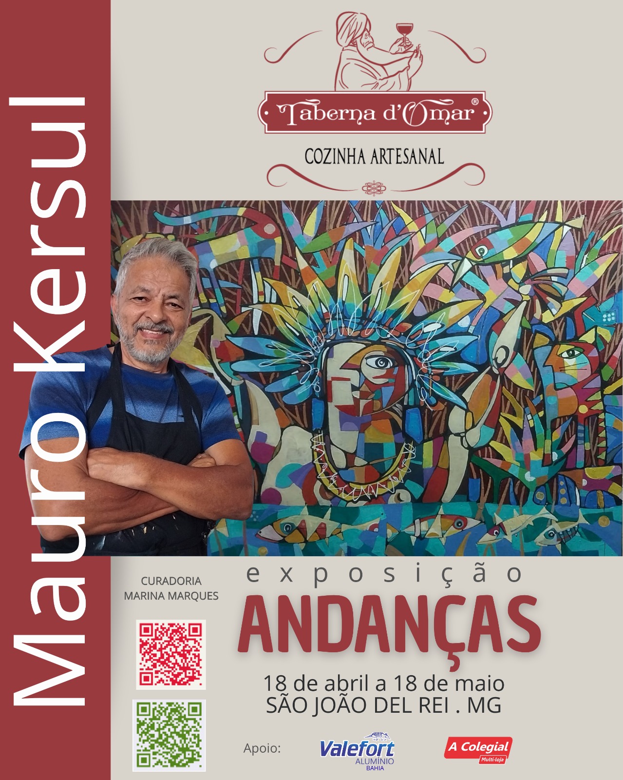 A exposição “Andanças”, do artista Mauro Kersul, será realizada entre os dias 18 de abril e 18 de maio de 2026, na Taberna d’Omar – Cozinha Artesanal, em São João del-Rei (MG). Com curadoria de Marina Marques, a mostra integra o circuito cultural da cidade, reunindo obras que dialogam com a trajetória e a produção contemporânea do artista.