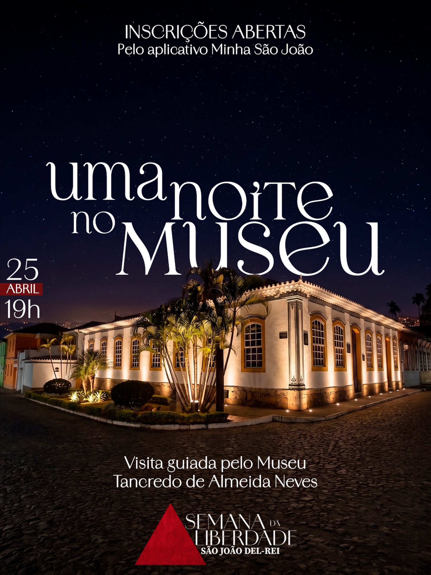 O evento “Uma Noite no Museu” integra a programação da Semana da Liberdade e será realizada no dia 25 de abril de 2026, às 19h, no Museu Tancredo de Almeida Neves, em São João del-Rei (MG). A proposta consiste em uma visita guiada noturna, proporcionando ao público uma experiência de imersão na história local em um dos principais espaços culturais da cidade.