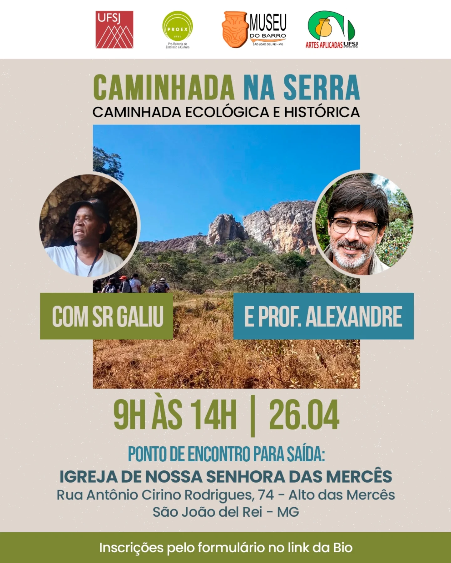 A atividade Caminhada na Serra: Caminhada Ecológica e Histórica será realizada no dia 26 de abril de 2026, das 9h às 14h, com saída da Igreja de Nossa Senhora das Mercês, localizada na Rua Antônio Cirino Rodrigues, 74, no bairro Alto das Mercês, em São João del-Rei (MG). A iniciativa integra ações do Museu do Barro e propõe uma experiência guiada pela Serra do Lenheiro.