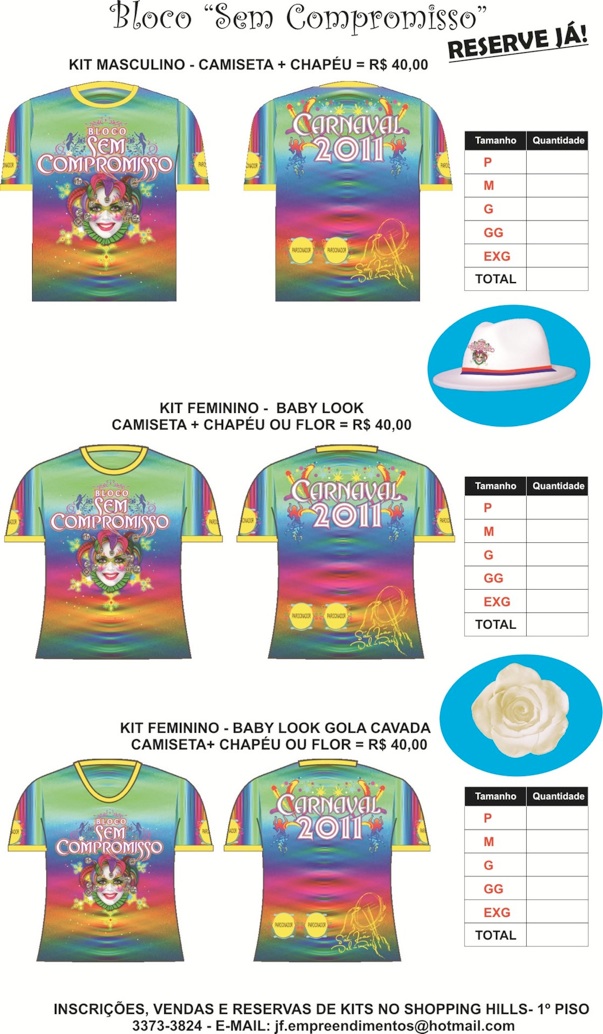 Estamos lançando um kit fantasia diferente com camiseta (padrão escola do Rio), chapéu e flor, com um design jamais apresentado no carnaval de nossa cidade.