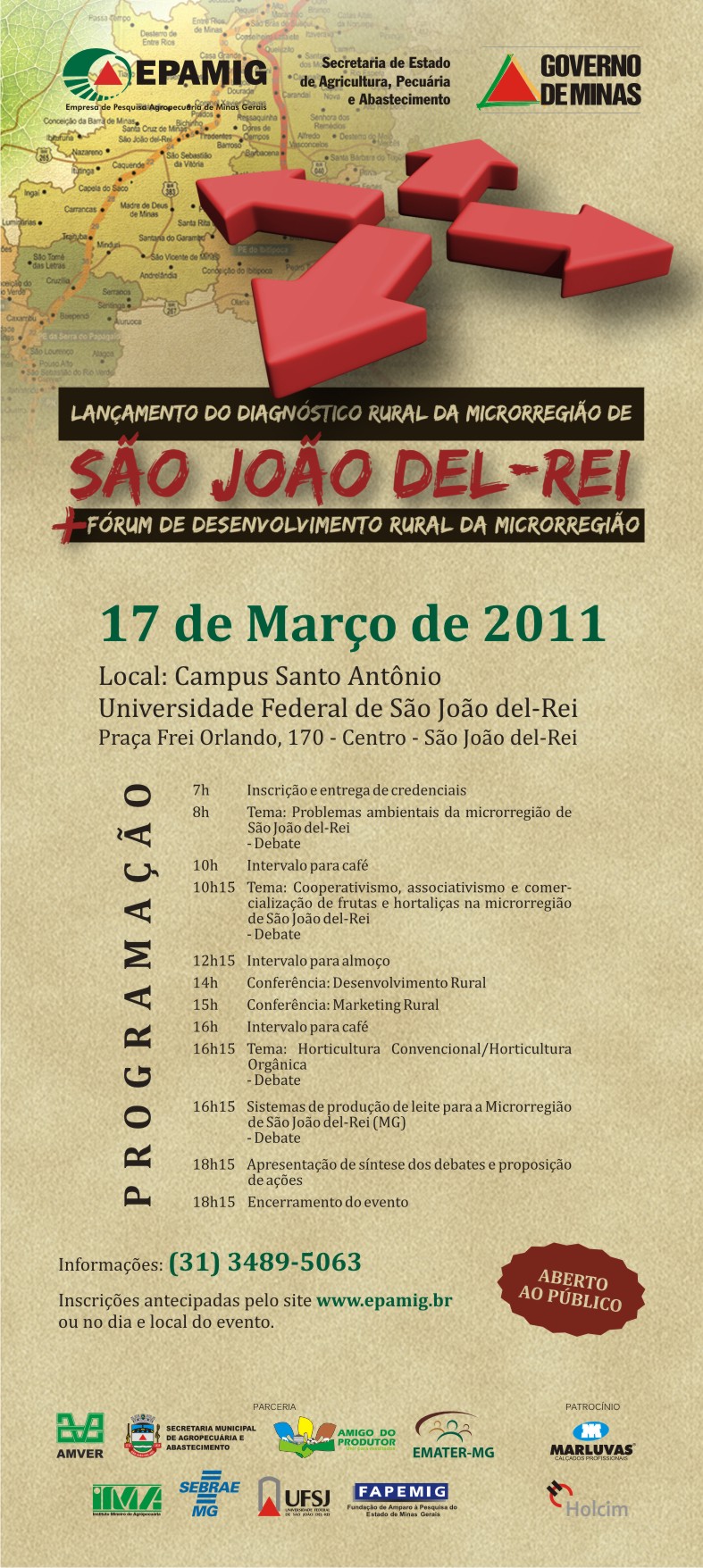As inscrições para o 1° Fórum de Desenvolvimento Rural da Microrregião são gratuitas e podem ser feitas pelo site www.epamig.br ou no dia do evento, no campus Santo Antônio, localizado na Praça Frei Orlando, n° 170, no Centro. Outras informações podem ser obtidas pelos telefones 031 3489 5063 ou 032 3379 2649.