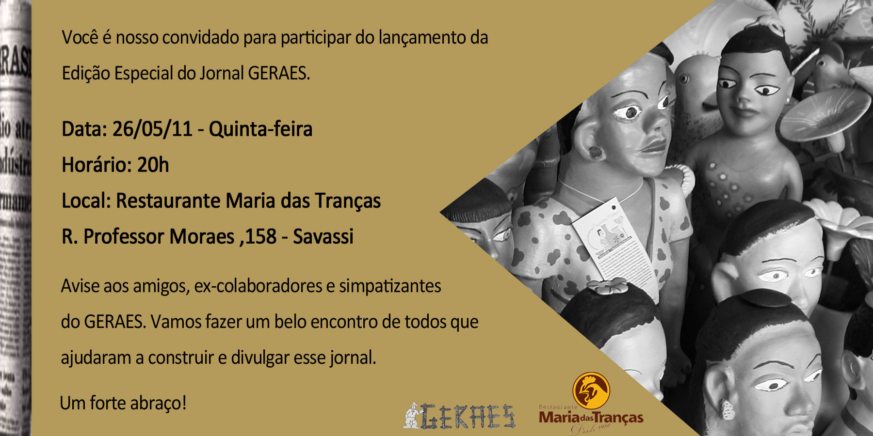 Na próxima quinta-feira, dia 26 de maio, às 20 horas, será o lançamento da edição especial do Jornal GERAES. O Jornal circulou no Vale do Jequitinhonha, de 1978 a 1985 e volta com uma edição especial, abordando a realidade do Vale do Jequitinhonha nos dias atuais.