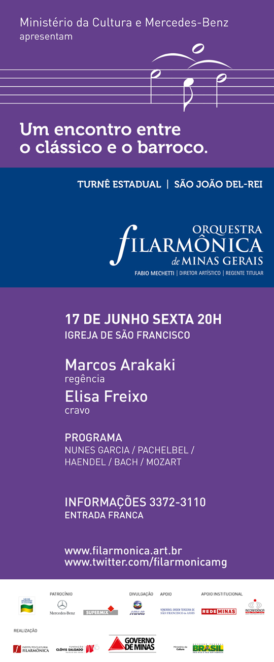 Como forma de dar prosseguimento à missão de divulgar a música sinfônica de qualidade, na próxima semana, a Filarmônica percorrerá importantes cidades históricas de Minas Gerais. De 16 a 19 de junho, a Orquestra se apresenta, respectivamente, em Tiradentes na Igreja Matriz de Santo Antônio; São João del-Rei, na Igreja São Francisco; Ouro Preto, na Igreja Matriz do Pilar e Mariana, na Igreja da Sé. Sob a batuta de Marcos Arakaki, regente assistente da Filarmônica, e com a participação da cravista Elisa Freixo, serão executadas, em todos os municípios, as peças Abertura em Ré, de Nunes Garcia; Canon, de Pachelbel; Concerto para cravo e orquestra, de Haendel; Suíte orquestral nº 3, de Bach, e Sinfonia nº 31 – “Paris”, de Mozart.