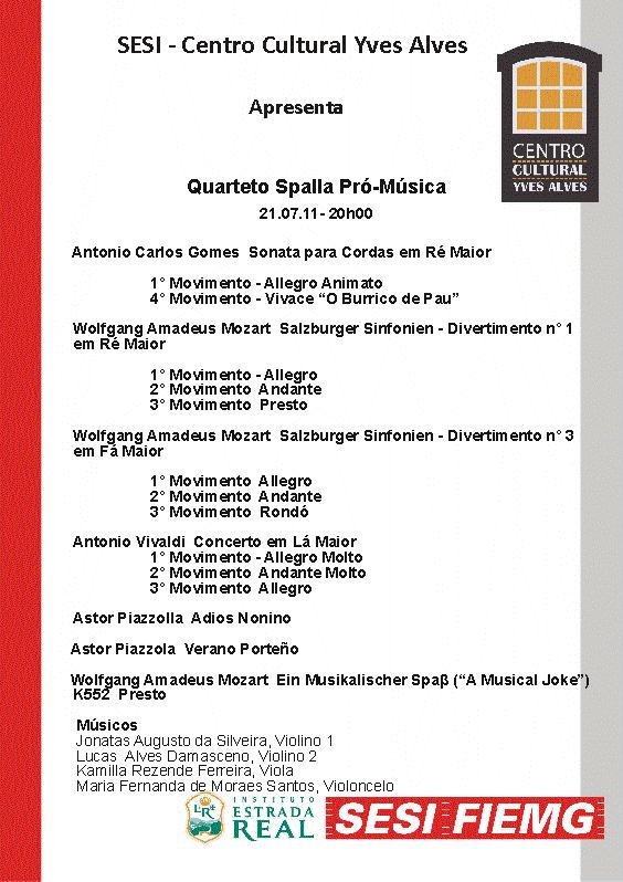 Formação: Jonatas Augusto da Silveira – Violino 1, Lucas Alves Damasceno – Violino 2, Kamilla Rezende Ferreira – Viola, Maria Fernanda de Moraes Santos – Violoncelo