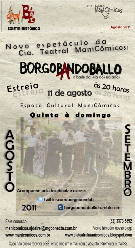 A falta de informações sobre um acontecimento em 1889 na cidade de São João del-Rei deixou aberta a possibilidade para a Companhia Teatral ManiCômicos imaginar hipóteses e, a partir daí, montar o espetáculo Borgobandoballo, que estreia na próxima quinta-feira, 11, e fica em cartaz por dois meses, de quinta a domingo, às 20h, no Espaço Cultural ManiCômicos. "Um jornal daqui de São João del-Rei daquela época relata que imigrantes italianos que vieram para cá foram colocados em um trem e expulsos da cidade. Porém não há registros nem notícias, do que aconteceu com eles, de onde foram parar. Essa hipótese foi uma grande provocação, um estímulo para criarmos a peça", contou o integrante da companhia e diretor do espetáculo, Juliano Pereira.