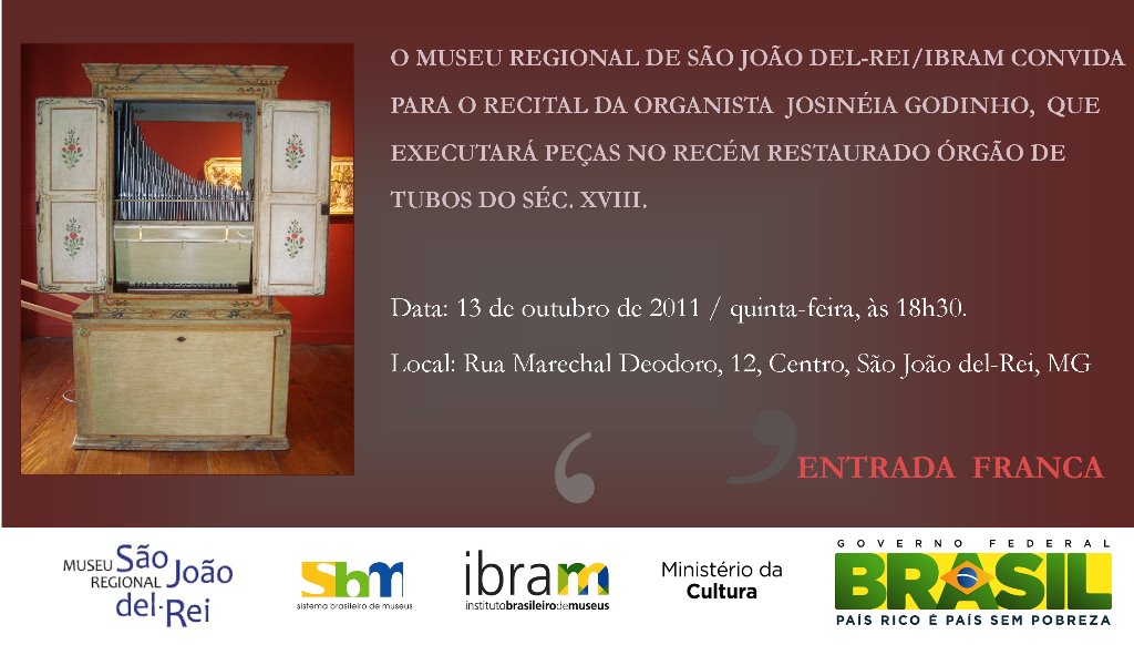 O Museu Regional de São João del-rei/IBRAM realiza no próximo dia 13 de outubro, às 18h30, mais um recital do órgão de tubos com a organista Josinéia Godinho . O evento, aberto ao público, acontece na galeria térrea do museu e faz parte de um conjunto de apresentações de uma das mais importantes peças do seu acervo.