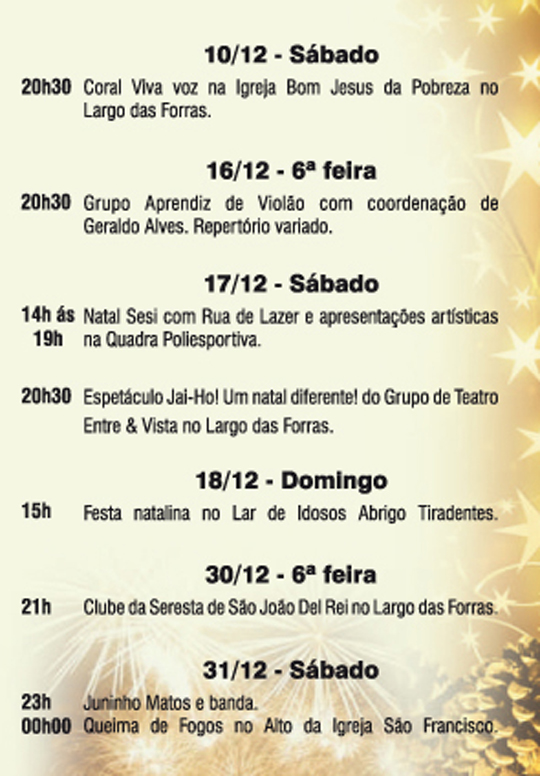Tiradentes em festa . Comemorações de fim de ano com apresentações artísticas, teatrais e musicais, bazar de Natal, rua de lazer, etc. 3 a 31 de Dezembro