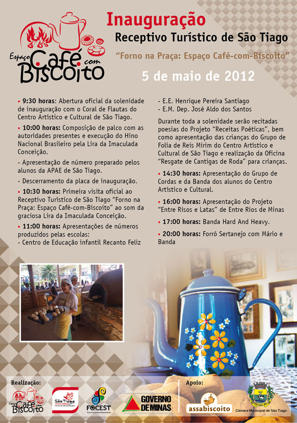 São Tiago, distante 45 quilômetros de São João del-Rei, vai ter festa do café-com-biscoito toda semana, a partir do dia 5 de maio. É que vai ser inaugurado o espaço permanente do forno à lenha na praça central da cidade.