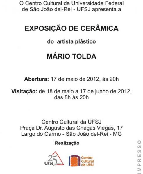 Está aberta até o dia 17 de junho, no Centro Cultural da Universidade Federal de São João del-Rei (UFSJ), a exposição de cerâmica do artista plástico Mário Tolda. Segundo depoimento do artista à assessoria da universidade, “a exposição se compõe em dois tempos. O primeiro reflete um pouco sobre a forma circular das relações, pois o círculo é perfeito como as relações interpessoais deveriam ser. E a segunda fase são recortes e sensações do cotidiano, cada uma me inspirando de uma maneira própria”.
