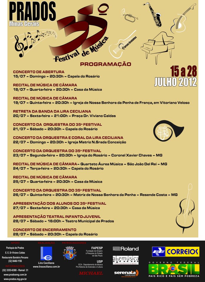A realização do 35.º Festival de Música de Prados, de 15 a 28 de julho de 2012, visa dar continuidade a trabalhos que vêm sendo desenvolvidos ao longo dessas três últimas décadas. O principal objetivo é o fomento e aprimoramento das atividades musicais em Prados. Além disso, o Festival de Música visa dar oportunidade de vivência científica e pedagógica para estudantes de música, em especial da Universidade de São Paulo, que têm a incumbência de exercer atividades de ensino e pesquisa como monitores devidamente orientados por seus professores responsáveis. Outro objetivo é a continuidade de pesquisas musicológicas que visam à documentação e catalogação do rico acervo de partituras da Lira Ceciliana, que é tombado pelo Fundo Municipal do Patrimônio, de Prados, e do acervo de composições de Adhemar Campos Filho.