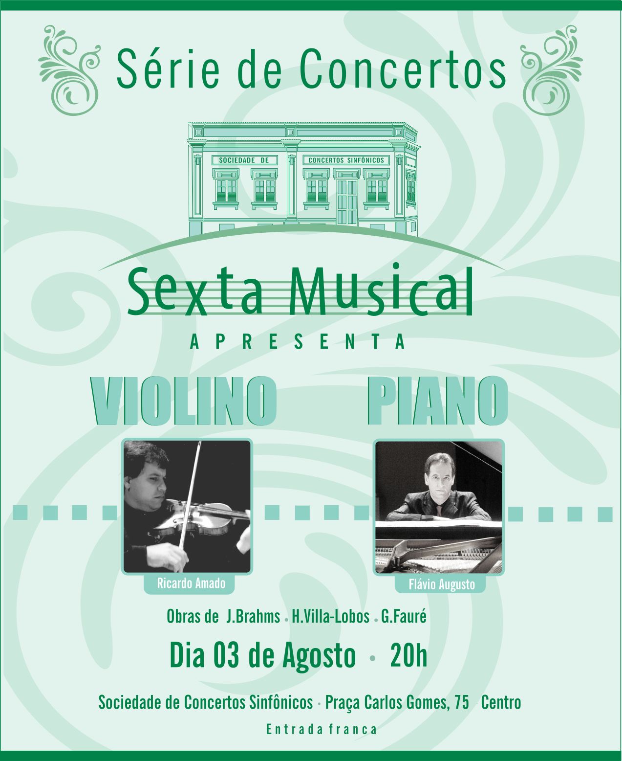A Sociedade de Concertos Sinfônicos de São João del-Rei realizará a terceira apresentação da Série de Concertos Sexta Musical. O Concerto acontecerá no dia 03 de agosto, às 20h, na sede da Sinfônica, situada na Praça Carlos Gomes, 75 no Centro. O recital será realizado pelos importantes músicos Ricardo Amado (violino) e Flávio Augusto (piano) com obras de Brahms, Villa Lobos e Fauré. Os músicos ainda irão oferecer masterclasses gratuitas de violino e piano no dia 04 de agosto (sábado), às 09h, no Conservatório Estadual de Música.