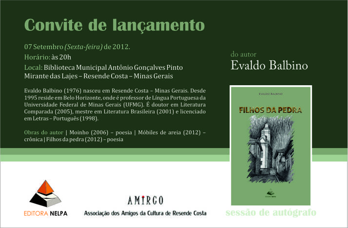 Filhos da pedra foi lançado primeiro, dia 17 de agosto, na 22ª Bienal Internacional do Livro de São Paulo. Mas no dia da Independência, Evaldo Balbino cantará a sua canção do exílio sobre a pedra de sua terra natal. Com promoção da AMIRCO (Associação dos Amigos da Cultura de Resende Costa), o lançamento do livro acontecerá no dia 7 de setembro, às 20h, na Biblioteca Municipal, no Mirante das Lajes, em Resende Costa – MG. Em Belo Horizonte, entretanto, Filhos da Pedra será lançado no dia 18 de setembro, numa terça-feira. Isso vai ocorrer na Livraria Status, Rua Pernambuco, 1.150, Savassi.