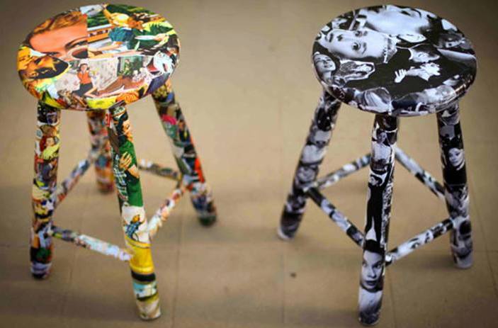 18h - Oficina de reciclagem utilizando técnica de colagem e decoupagem com xerox de fotos em papel para transformação de embalagem de vidros e banquetas em novos objetos de decoração.