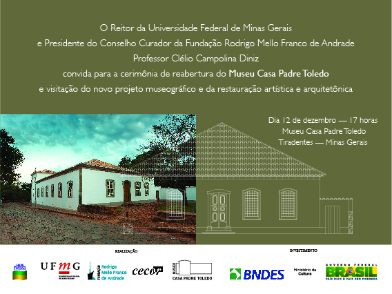 A Universidade Federal de Minas Gerais e a Fundação Rodrigo Mello Franco de Andrade tem o prazer de convidar para reabertura do Museu Casa do Padre Toledo em Tiradentes no dia 12 de dezembro de 2012, ás 17h, à Rua Padre Toledo, 190 - Centro.