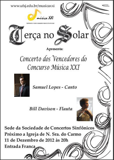 Como parte da agenda do Terça no Solar, os vencedores do concurso Música XXI, William Percy Davison e Samuel Lopes, apresentam na terça-feira, 11 de dezembro, recital de flauta transversal e canto. O evento acontece na Sociedade de Concertos Sinfônicos, às 20h. A entrada é franca.