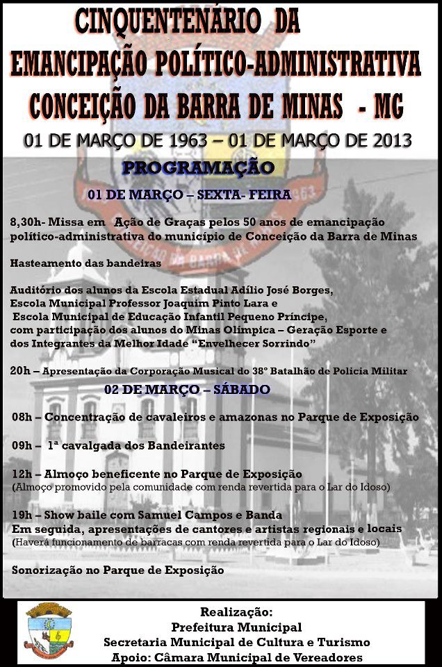 Festa de 50 anos da emancipação política de Conceição da Barra de Minas . 1 e 2 de Março