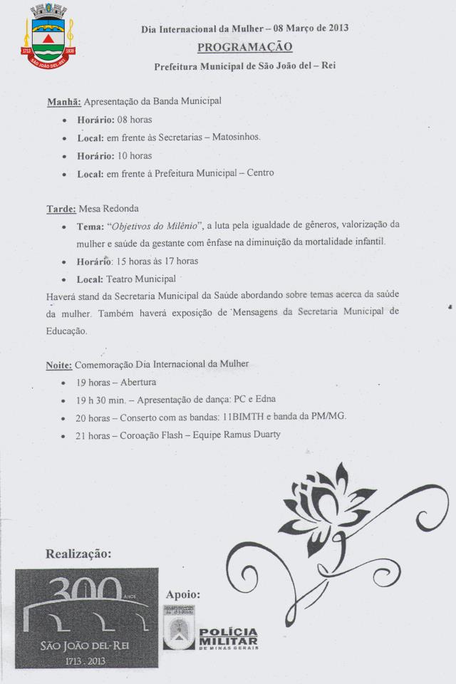 Dia Internacional da Mulher . Programação da Prefeitura Municipal de São João del-Rei