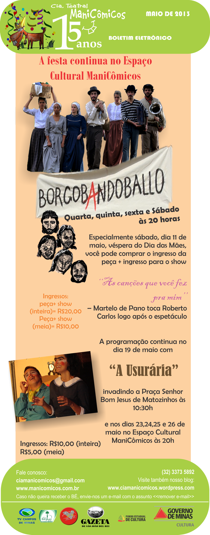 Um grupo de imigrantes italianos anarquistas foi expulso da região no século XIX após reivindicar melhores condições de trabalho nas lavouras locais. Depois disso, porém, não tem nenhum registro na história sobre o que aconteceu com essas pessoas. O instigante caso é o cerne do espetáculo teatral Borgobandoballo, que volta ao palco do Espaço Cultural ManiCômicos neste mês, de 8 a 11; de 16 a 19; e de 23 a 26; às 20h. Os ingressos serão vendidos a preços populares no dia das apresentações. O local fica na Rua Industrial Paulo Agostini, nº 55, na Vila Nossa Senhora de Fátima. Informações podem ser obtidas pelo telefone (0**32) 3373-5892.