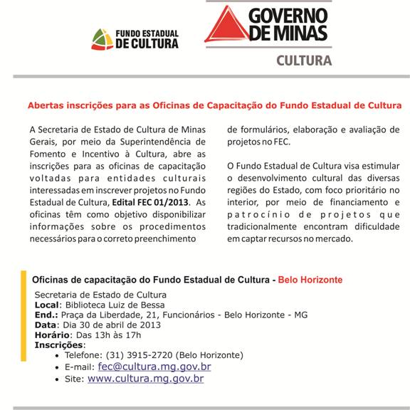 As oficinas de capacitação têm como objetivo dar às entidades culturais informações sobre os procedimentos de elaboração e avaliação de projetos apresentados ao FEC. As oficinas serão ministradas pela equipe do Fundo Estadual de Cultura das 13h às 17h.