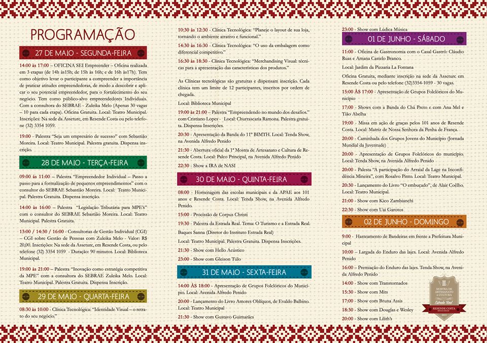 1ª Mostra de Artesanato e Cultura de Resende Costa . 29 de Maio a 2 de Junho