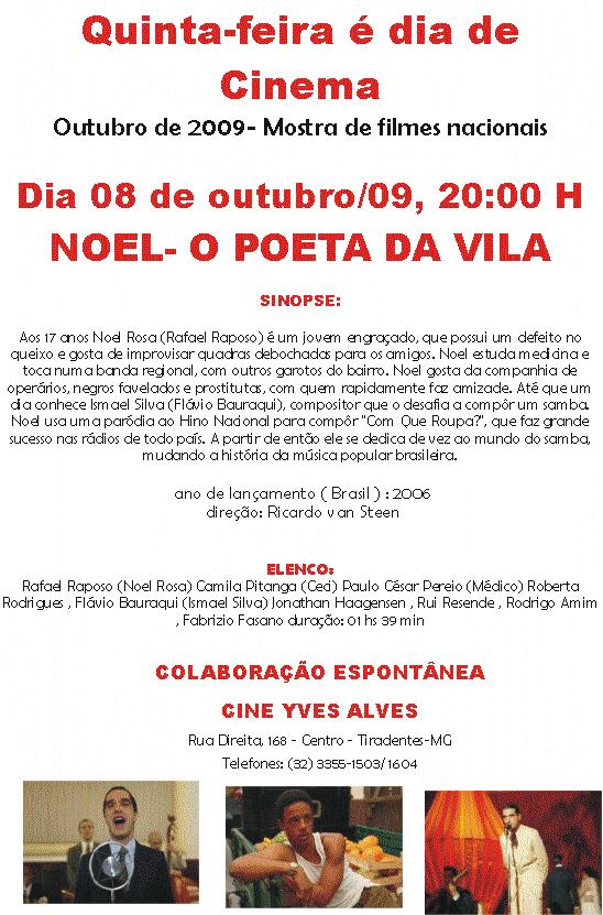 No dia 08 de outubro,Quiinta-feira, às 20:00 h, sessão do filme : NOEL- O POETA DA VILA - ENTRADA GRATUITA.