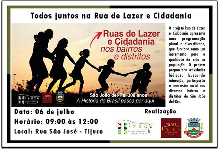No sábado, dia 6 de julho, o bairro do Tijuco recebe as atividades da rua de lazer e cidadania. Promovidas pela Secretaria de Cultura, Turismo, Esporte & Lazer, o projeto apresenta uma programação plural e diversificada, que funciona como um incremento para a qualidade de vida da população.